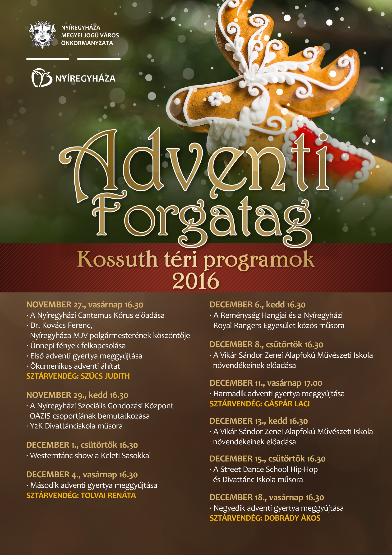 Vasárnap pedig az eső sem tartotta vissza a nyíregyháziakat, hogy részt vegyenek az első adventi gyertya gyújtásán, illetve a Kossuth téri programon. Mostantól egészen január1-jéig rendszeresen lesznek fellépők Kossuth téren felállított színpadon.